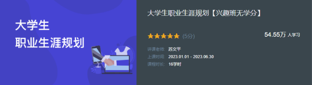 《大学生职业生涯规划》于2008年春季在北航开设为全校选修课, 15年来持续授课,被学生誉为“五星级选修课”,2015年开发MOOC课程,通过慧科高校邦平台上线,目前已有全国180所高校及社会人士累计54.5万余人注册学习、广受好评。