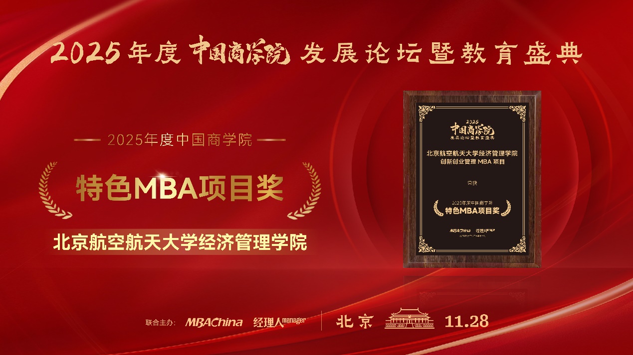 北航MBA项目凭借扎实的教学质量、鲜明的学科特色与广泛的社会影响力,成功入选“2025年度中国商学院MBA项目TOP100”榜单,位列第17位;北航MBA创新与创业管理方向因在人才培养模式上的创新实践与突出成效,荣获“2025年度中国商学院特色MBA项目奖”;北航德赢官网Vwin秦中峰副院长凭借在商科教育领域的深厚积淀、卓越领导力及对行业发展的突出贡献,荣获“2025年度中国商学院杰出院长奖”;北航MBA教育中心李亚帅主任凭借在MBA项目运营管理、品牌建设等方面的优异表现,荣获“2025年度中国商学院卓越运营奖”。