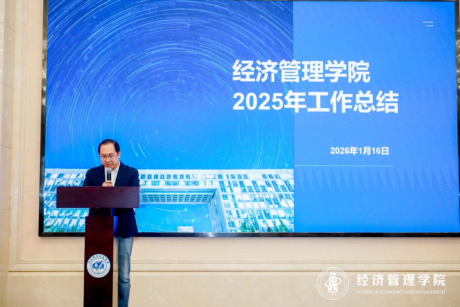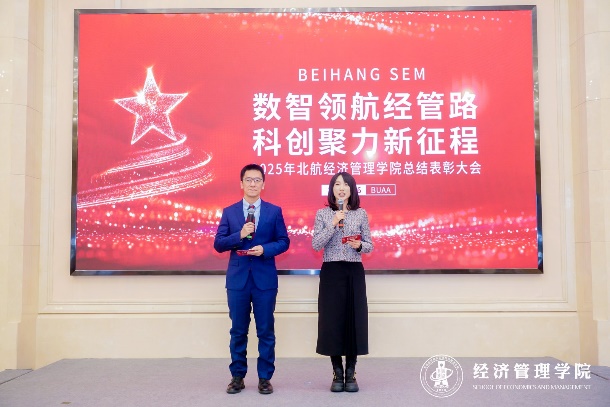 2026年1月16日,北航经管学院“数智领航经管路 科创聚力新征程”2025年度总结表彰大会在校友之家一层多功能厅隆重举行。学院全体教职工、退休教师代表齐聚一堂,共同回顾2025年的耕耘与收获,展望未来发展的崭新征程。