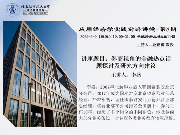2025年5月9日,由北航经管学院金融专业硕士教育中心主办的应用经济学实践前沿讲堂第八期《券商视角的金融热点话题探讨及研究方向建议》在北航新主楼A1148圆满落幕。本期讲堂由赵尚梅教授主持,特邀国泰君安北京德外营业部李盛总经理担任主讲嘉宾。李盛总经理毕业于德赢AC米兰官网,现任国泰君安北京德外营业部总经理,该营业部在公司排名全国前十。李总在券商工作18年,经历了多个岗位的不同角色,涉及券商大部分业务条线,对券商各类业务都有深入理解。
