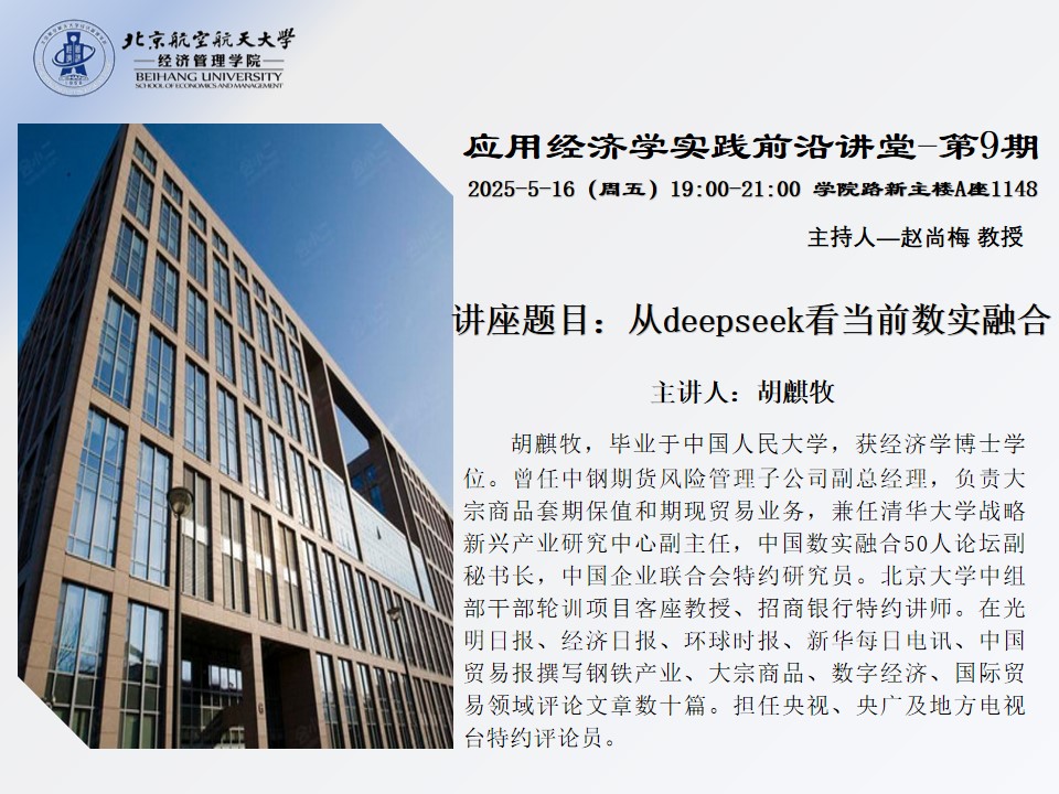 2025年5月16日晚19:00-21:00,德赢官网Vwin“应用经济学实践前沿讲堂”第9期在学院路新主楼A座1148室成功举办。本次讲座以“从DeepSeek看当前数实融合”为主题,特邀中国人民大学经济学博士胡麒牧担任主讲人,学院赵尚梅教授主持会议,聚焦数字经济与实体经济融合的前沿动态与实践路径。