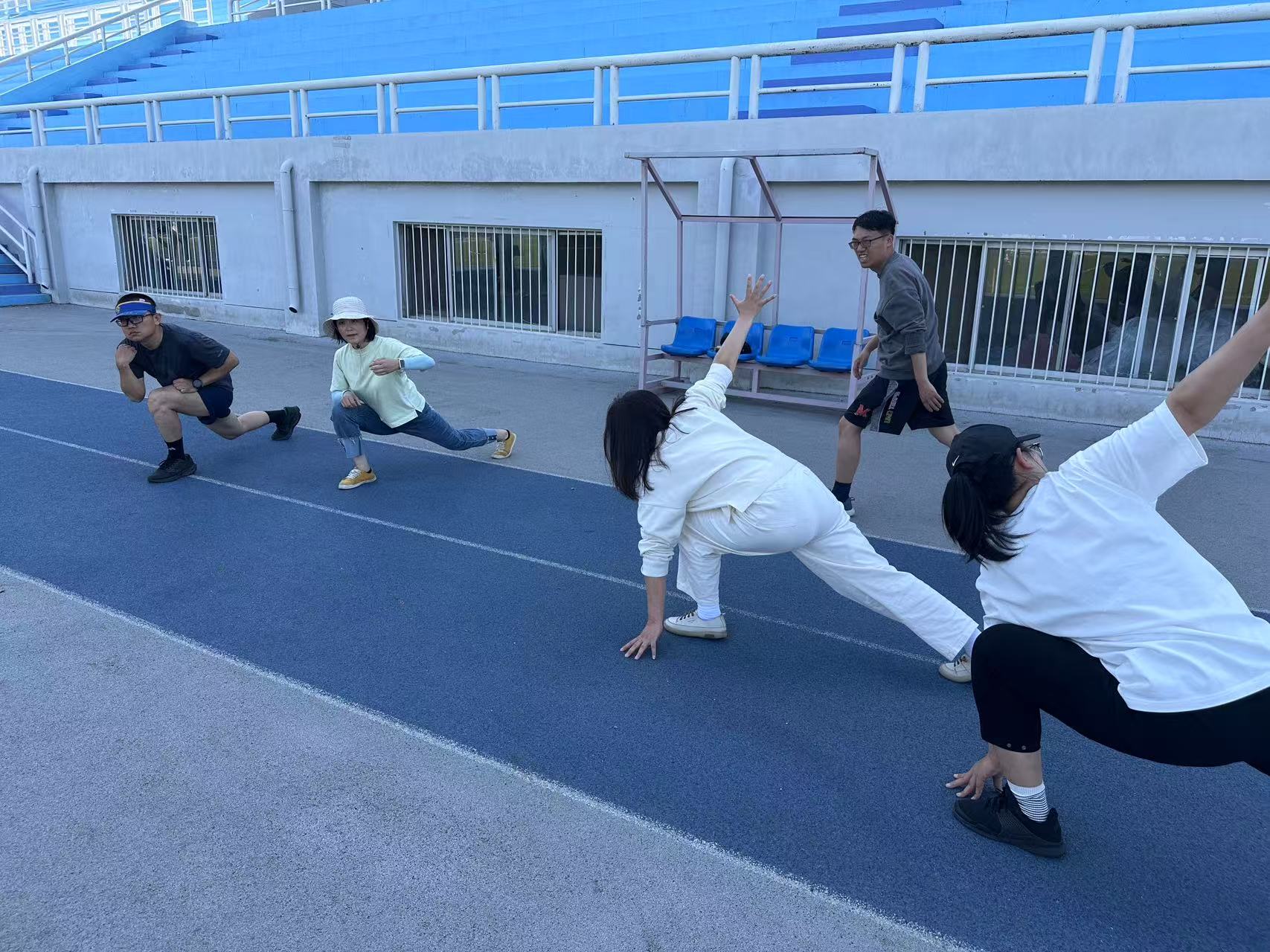 在实操环节中,何老师带领教师们围绕操场进行跑前热身,并现场演示跑姿、摆臂、落地节奏等关键技术动作。针对部分教师在动作中的常见错误,他一一进行纠正与讲解,并鼓励大家关注身体信号、量力而行,构建“安全、有趣、可持续”的运动模式。