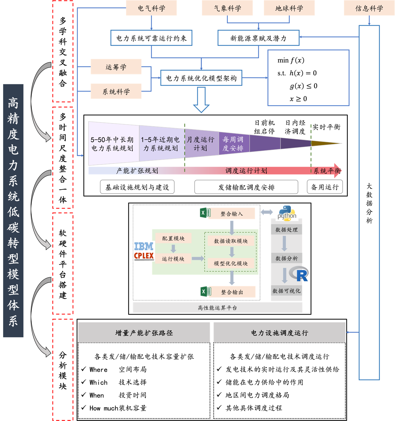 √ 方法上,综合电气科学、系统科学、运筹学、信息科学等多学科方法,构建实现我国中长期与短期多时间尺度电力系统供需平衡的高时空分辨率电力优化模型体系,提高电力系统低碳发展决策的精度和可靠性。