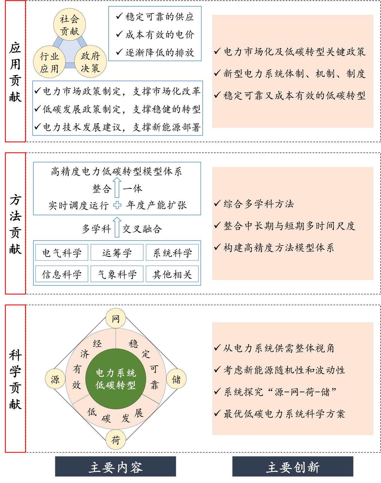 √ 应用上,为电力行业的相关技术有序持续发展提供建议,为政府部门的电力市场化改革以及电力低碳转型关键政策设计提供支持,为全社会的稳定可靠又成本有效的电力供应做出具体贡献。