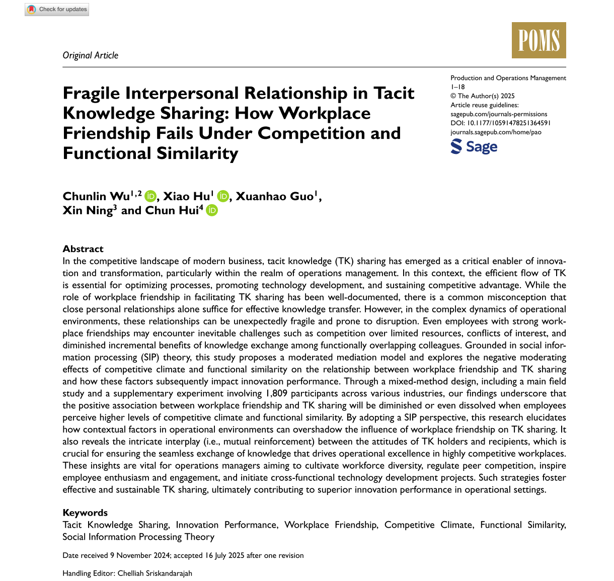 近日,国际管理学领域顶级期刊《Production and Operations Management》(UT/Dallas 24)在线刊登了德赢官网吴春林副教授及其合作者的研究论文“Fragile Interpersonal Relationship in Tacit Knowledge Sharing: How Workplace Friendship Fails Under Competition and Functional Similarity(隐性知识共享中的脆弱人际关系:职场友谊如何在竞争和功能相似性下失效)”。吴春林副教授为第一作者,德赢官网2024级博士生胡晓为第二作者...
