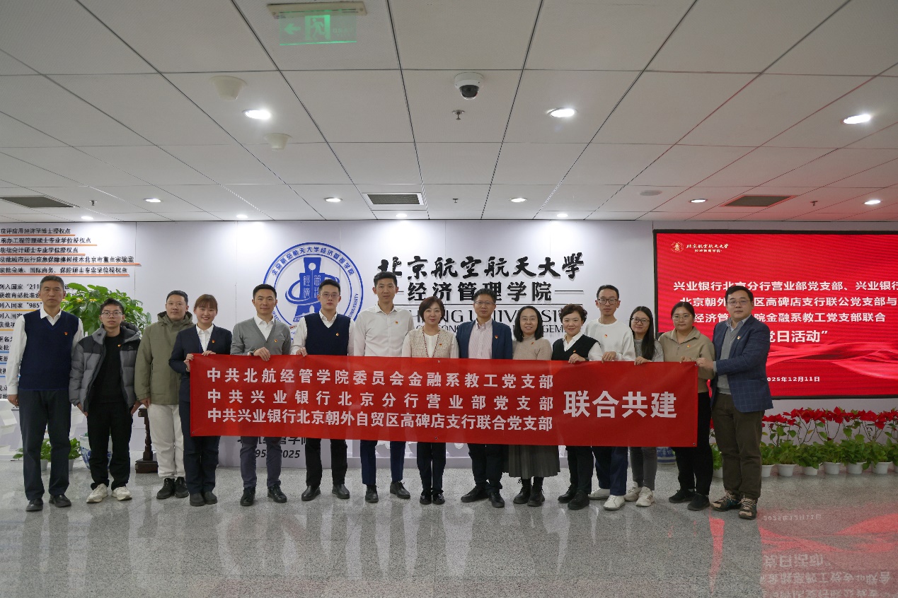 12月11日下午,德赢官网Vwin金融系教工党支部与兴业银行北京分行营业部党支部、北京朝外自贸区高碑店支行联公党支部联合举办党日活动。德赢官网Vwin党委书记郑海涛、金融系教工党支部书记张军欢、金融系系主任部慧、兴业银行北京分行营业部总经理、党支部书记孙俪,北京分行营业部副总经理潘晨晖,经管学院金融系教工党支部、兴业银行北京分行营业部党支部及辖属机构共20余人参加此次活动。活动当天,双方首先共同参观了北航校...